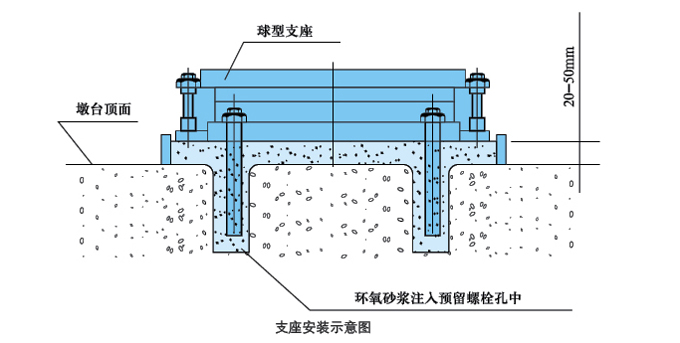 b、安裝支座及地腳螺栓:在下支座板四角用鋼楔塊調整支座水平,并使下支座板底面高出橋墩頂面 20 - 50mm,找正支座縱、橫橋向中線位置,使之符合設計要求。用環(huán)氣砂漿灌注地腳螵栓孔及支座底面墊層 (見下圖>。
