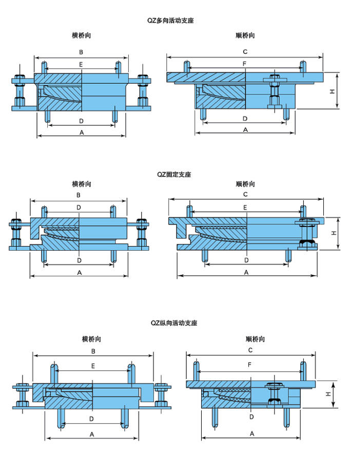 盆式橡膠支座承載能力大、水平位移大的特點,而且能 適應大轉角的需要,適用于寬橋、曲線橋。由于承壓部件不使用橡膠件,不存在橡膠低溫脆性老化等影響,因 此特別適用于彳R溫地區(qū)。