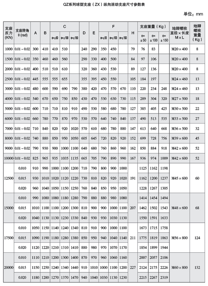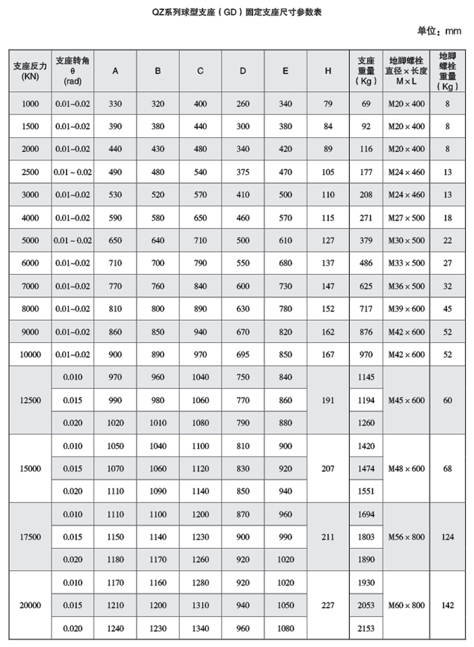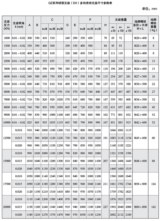 3、QZ系列球型支座的主要技術性能: a、支座反力(豎向承載力)分為 16級:1000、1500、2000、2500、3000、4000、5000、6000、7000、 8000、 9000和10000、 12500、 15000、 17500、 20000KN。