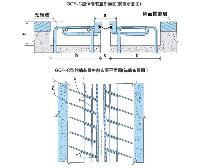 圖中:h、b分別為預留槽深度與寬度,a為錨固筋與邊梁之間的角度,用戶可根據橋梁實際預留槽尺寸 選擇GQF~C、GQF-F. GQF-E. GQF—Z. GQF~L中所列任一種,如用戶有特殊要求,可向我公司提 供具體圖紙,我公司將為您另行設計。