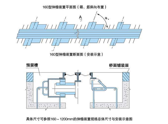 為適應河流方向與行車路線不垂直的橋梁需要,可將錨固鋼筋和位移控制箱斜向布置,即將伸縮量為0~ 80mm的各種伸縮裝置及I60~1200mm的模數式伸縮裝置的錨固鋼筋及位移控制箱水平傾斜的焊在異型邊梁 上,其錨固鋼筋與邊梁的交角隨橋梁的傾斜方向與傾斜程度而改變。