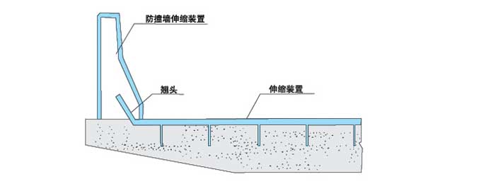 為了防止橡膠密封袋內的積水流向墩臺,可在伸縮裝置兩端設置翹頭,伸縮裝置的翹頭可根據不同的路面設計不同的樣式(翹起來長度及角度),翹頭一般置于防撞墻內部。如下圖所示: