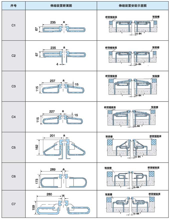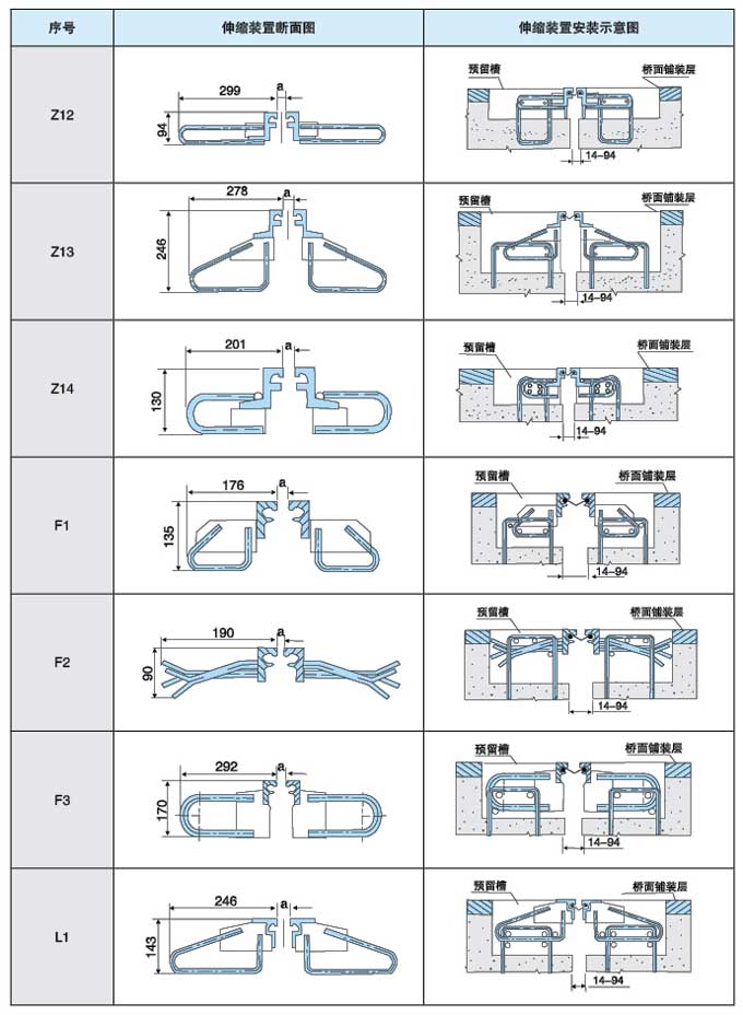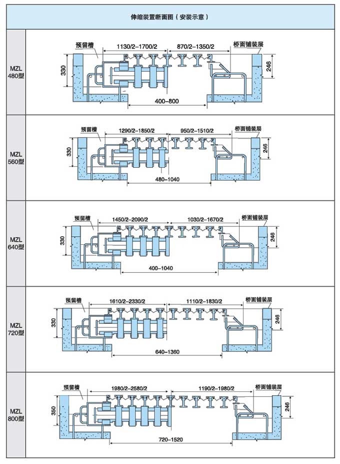 橋梁伸縮裝置各種規(guī)格總體尺寸與安裝示意圖