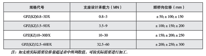 本系列支座設(shè)計承載力分31 級,即0.8、1、1.25、1.5、2、2.5、3、3.5、4、5、6、7、8、9、10、 12.5、15、17.5、20、22.5. 25、27.5、30、32.5 , 35、37.5、40、45、50、55、60MN。支座設(shè)計承載力 允許超載10%。