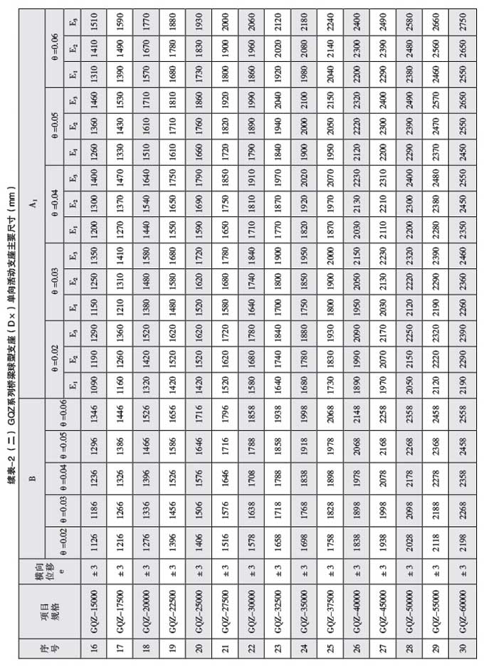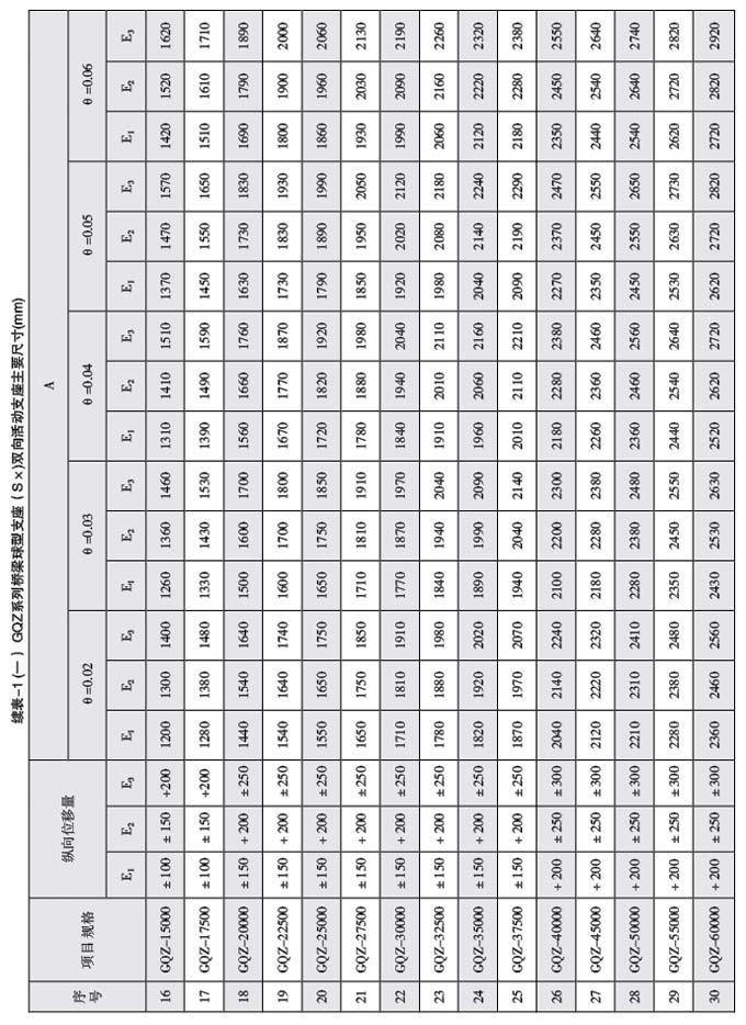 1、支座豎向承載力分為30級,1000、1500、2000、2500、3000、3500、4000、4500、5000、6000、 7000、 8000、 9000、 10000、 12500、 15000、 17500、 20000、 22500、 25000、 27500、 30000、 32500、 35000、 37500、 40000、 45000、 50000、 55000、 60000kNo